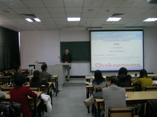 陈教授首先畅谈了自己求学及工作过程中与莎士比亚研究相关的众多往事,深入浅出地提出了莎士比亚的艺术成就及莎剧的汉译两个话题。之后,以莎士比亚的人生经历为主线,概述了莎剧的主要特点、人物塑造手法、及其作品的传播与影响,从横纵两个维度总结了其对后世戏剧、文学和英语语言发展的贡献。最后,陈教授分析了中国莎剧翻译的历史及现状,对莎剧汉译的语言学与戏剧美学标准进行了阐释,并以Measure for Measure为例,对比分析了梁实秋、朱生豪、英若诚、方平等译本,并在此基础上给出了自己的译本。