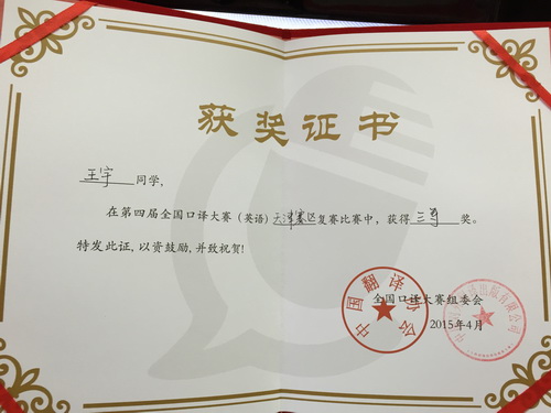 4 月 25 日上午,第四届全国口译大赛天津赛区复赛在天津外国语大学科研楼报告厅举行,来自南开大学、天津外国语大学、天津师范大学等高校的 21 名翻译方向的本科生和研究生同台竞技,共展风采。公司w66利来旗舰厅的三位研究生参加了角逐,并取得了可喜成绩,其中 2014 级研究生王宇获大赛三等奖,另两位选手鲁易和祝燕获优秀奖。w66利来旗舰厅副经理王占斌教授应邀担任评委,为本次大赛 5 位专家评委之一。