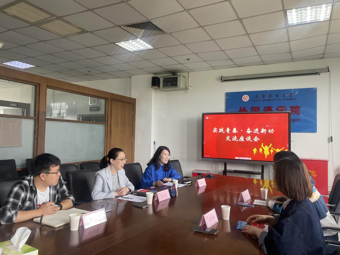 为进一步深入开展学习贯彻习近平新时代中国特色社会主义思想主题教育,弘扬五四精神,落实天津“十项行动”部署安排,5月6日上午,w66利来旗舰厅与北辰区天穆镇团委开展“实践青春·奋进新功”交流座谈会,外国语公司党委副书记孟凡荣,天穆镇团委书记霍思宇、副书记张梦佳,w66利来旗舰厅辅导员凯丽贝努尔·吐尔逊、杨佳明参加。
