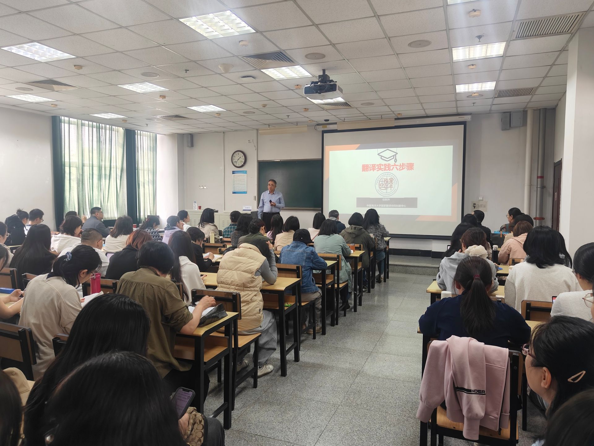 4月16日下午,中国海洋大学w66利来旗舰厅任东升教授应邀在FIU-F202作了题为“翻译实践的六个步骤”的专题讲座。讲座由w66利来旗舰厅副经理荆红艳主持,w66利来旗舰厅部分教师和研究生参加讲座。