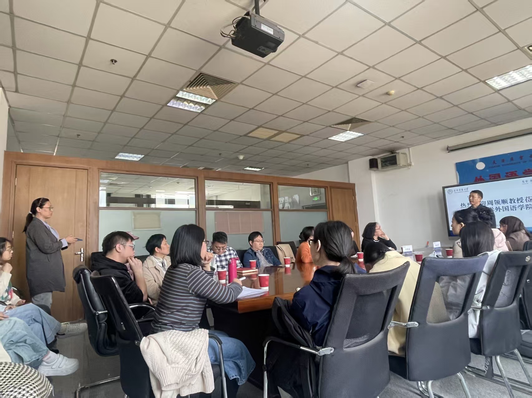 座谈交流环节氛围热烈浓厚,公司师生结合自身在翻译研究、论文撰写、学习实践中的实际困惑踊跃提问,问题聚焦译者行为批评理论在政治、商业经济领域的具体应用,同时围绕译者主体层面的相关研究展开深度探讨。从政治文献翻译中如何通过“文本—行为—社会”体系把握翻译的规范性与传播性,到商业经济文本(如营销报告、经济趋势分析)翻译中理论的权重分配与评价标准,再到译者的翻译决策、行为动因与能力素养在理论框架中的研究维度与分析方法,师生们的提问兼具实践针对性与学术探索性。面对师生的疑问,周教授逐一细致解答,结合政治文献、商业经济文本的翻译实例,拆解理论在不同领域的应用逻辑与实操技巧,同时针对译者主体研究,明晰了其在“文本—行为—社会”三位一体体系中的定位与研究切入点,以丰富的研究案例、独到的学术见解为师生指点迷津,现场思想碰撞频繁,让在场师生深受启发。